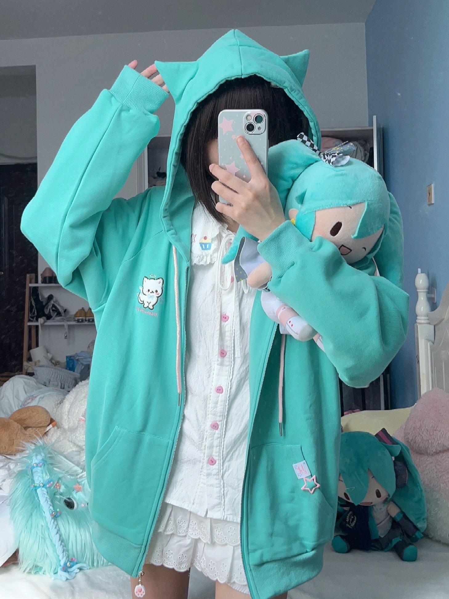 Y2K Angel Wings Meow Mint Turquoise Vocaloid Hatsune Miku Green Cute Cat Ears Japanese Girl Spring Comfy Hoodie Jacket