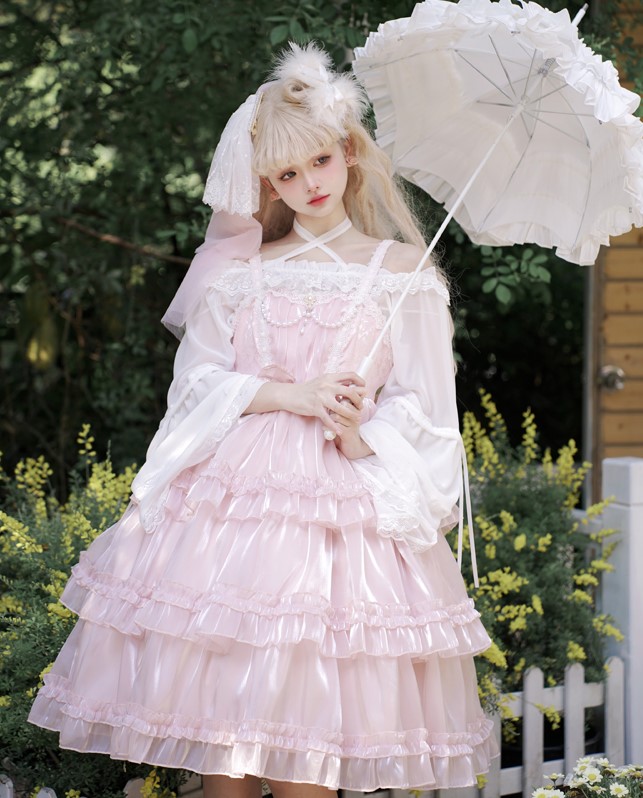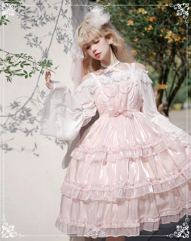 Love Song of the Star Japanese Girl Lace Bow Ribbon Ruffled Layered Princess Pink White Black Strap Dress