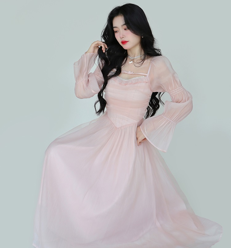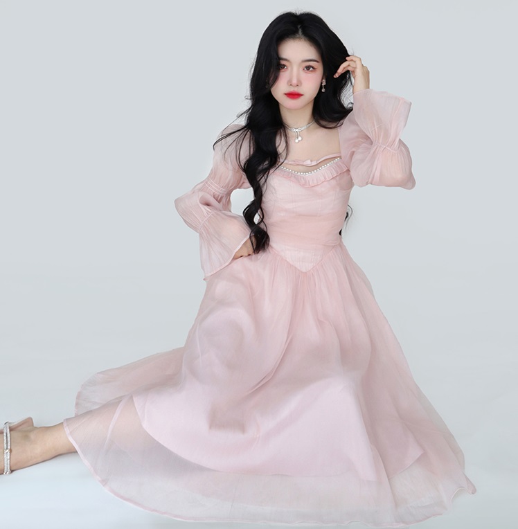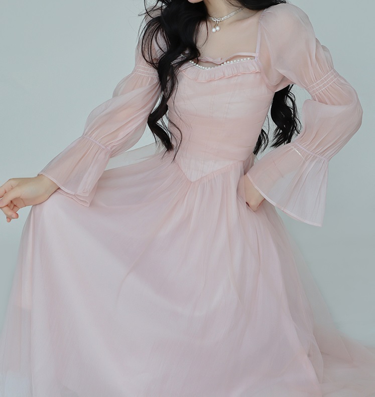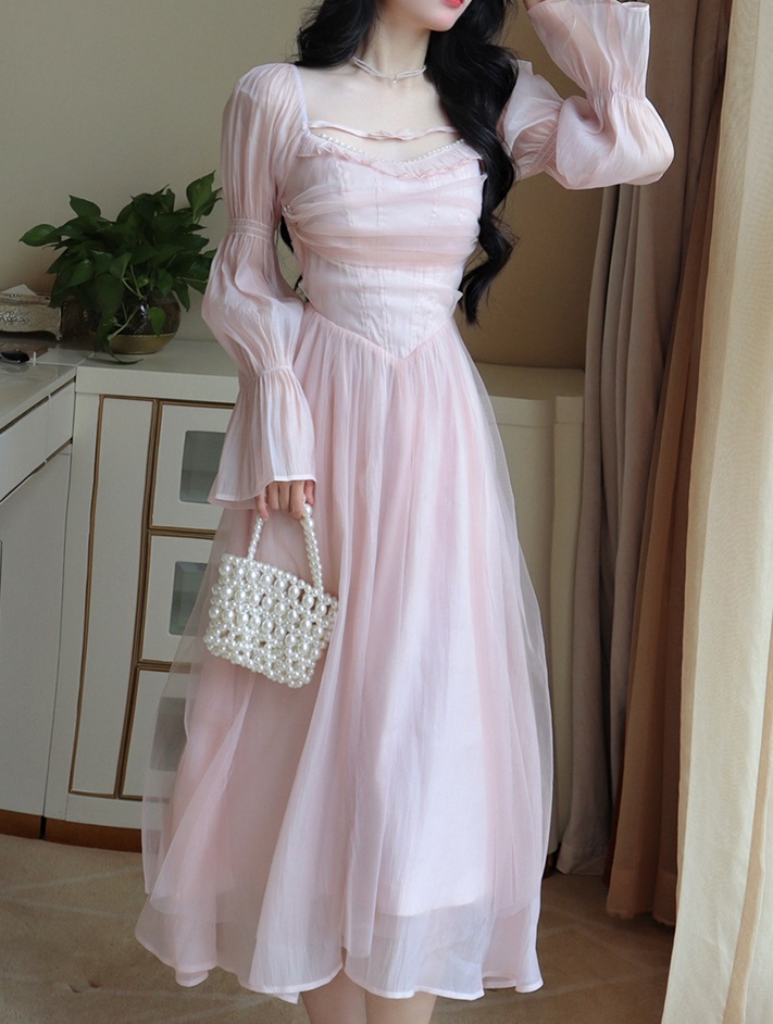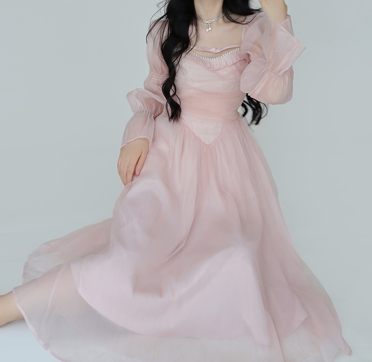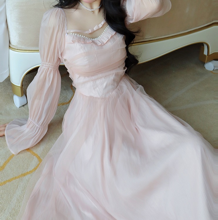French Elegant Classic High Waist Bow Lace Puff Pearl Princess Tulle Pink Dress