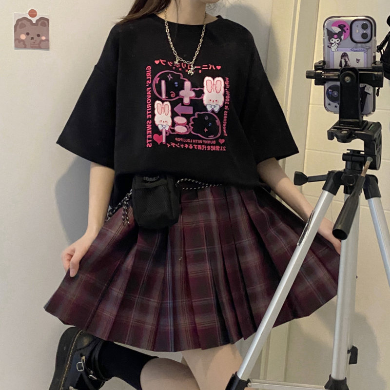 Bunny Lolipop E-girl Grunge Japanese Y2K Print Cotton Short Sleeved Oversize T-shirt Tees Top