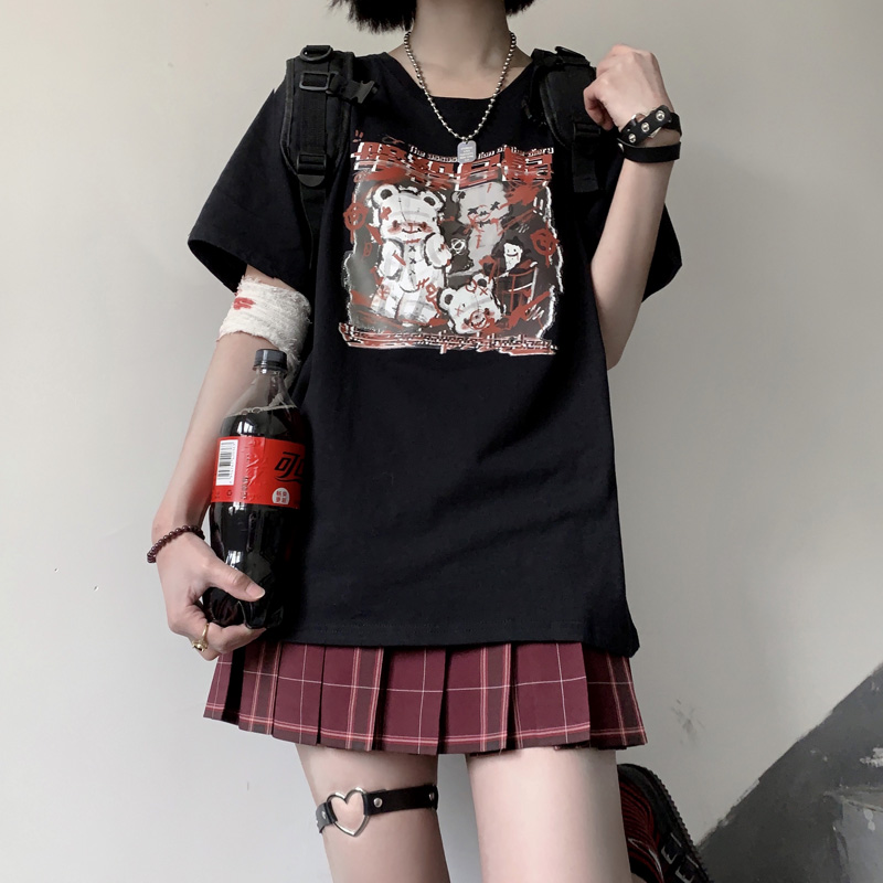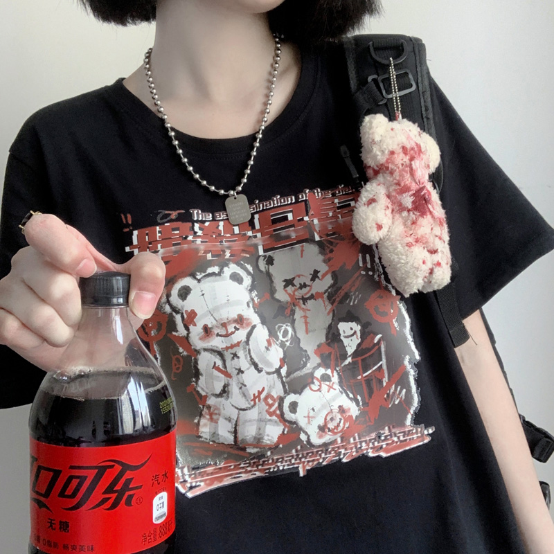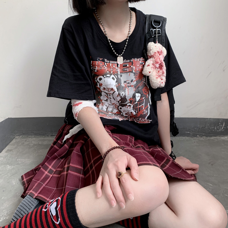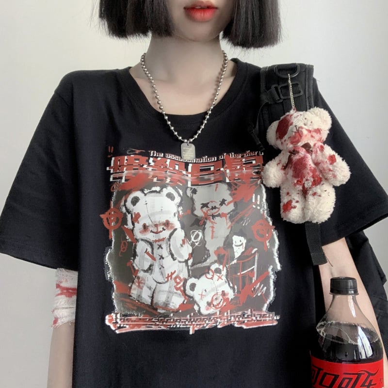Dark Diary Killer Teddy Bear Black Red Streetwear E-girl Grunge Japanese Y2K Print Cotton Short Sleeved Oversize T-shirt Tees Top