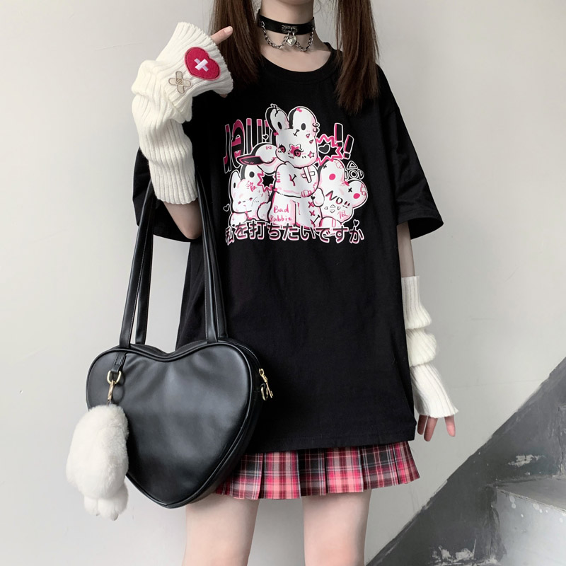Don't Hit the Bunny Rabbit Black White Streetwear E-girl Grunge Japanese Y2K Print Cotton Short Sleeved Oversize T-shirt Tees Top