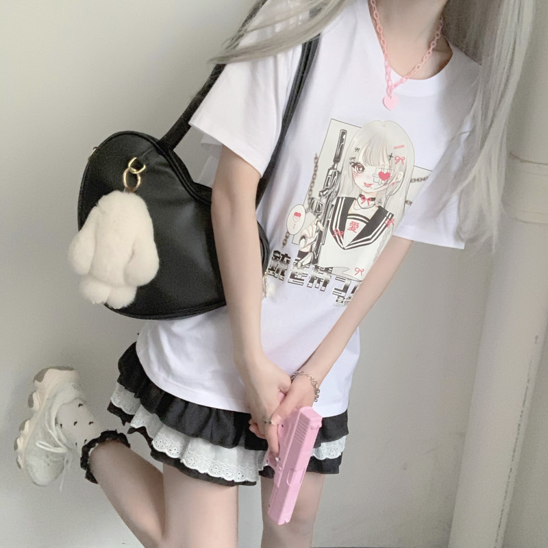 Angel Gunslinger Girl Black White Streetwear E-girl Grunge Japanese Y2K Print Cotton Short Sleeved Oversize T-shirt Tees Top
