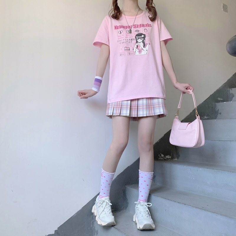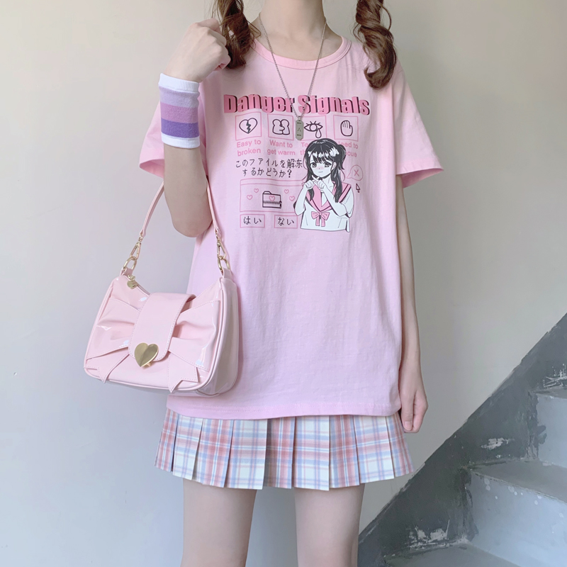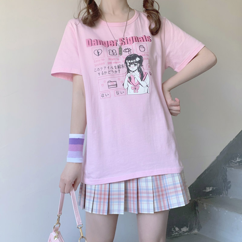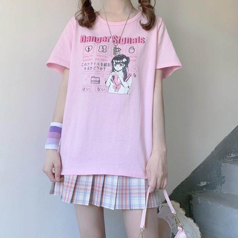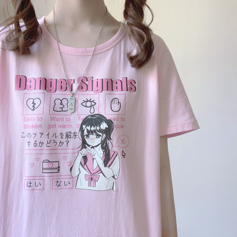 Danger Signals Pink Anime Streetwear E-girl Grunge Japanese Y2K Print Cotton Short Sleeved Oversize T-shirt Tees Top