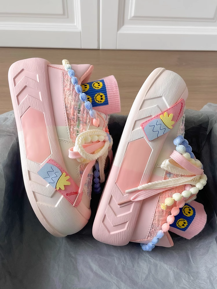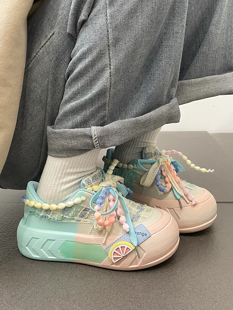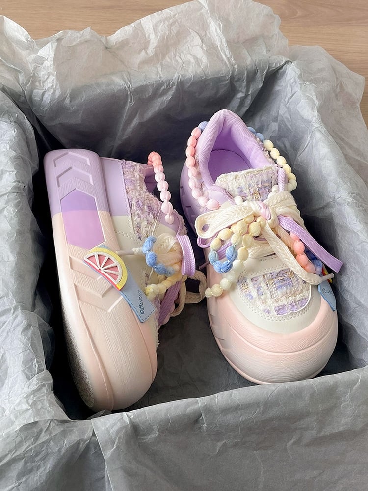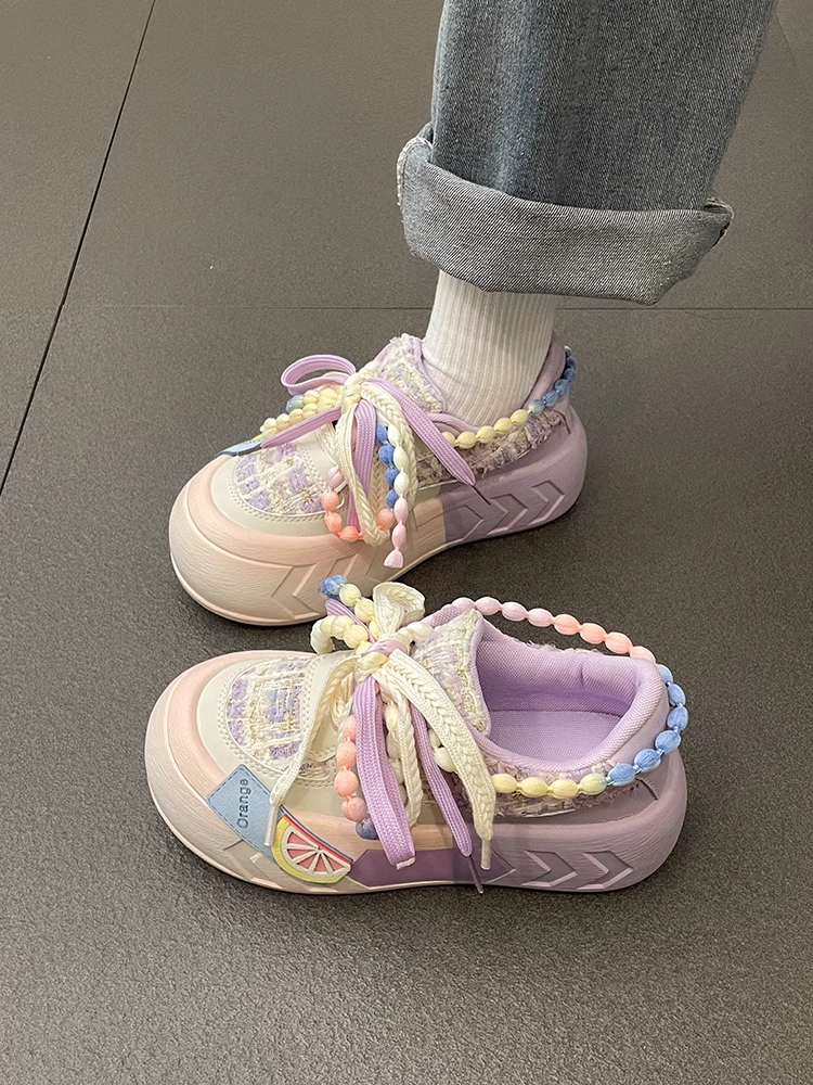 Beads Lace Color Pastel Decorative Summer Spring Girl Women Thick Big Soles White Pink Blue Purple Sporty Sneaker Shoes