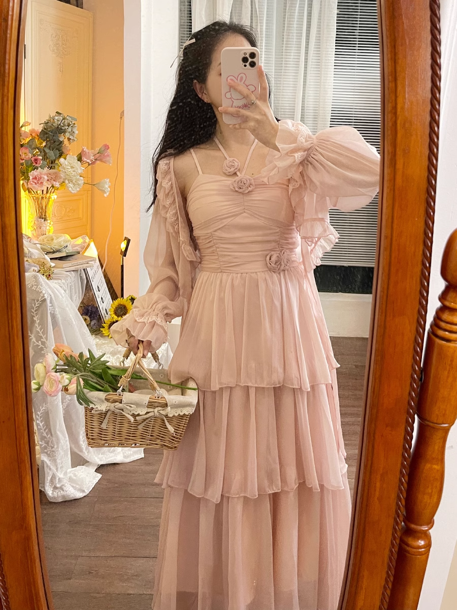 Rose Pastel Pink Pantone Beautiful Elegant Fairy Spring Summer Strap Chiffon Dress Sundress & Cardigan Two Piece Set