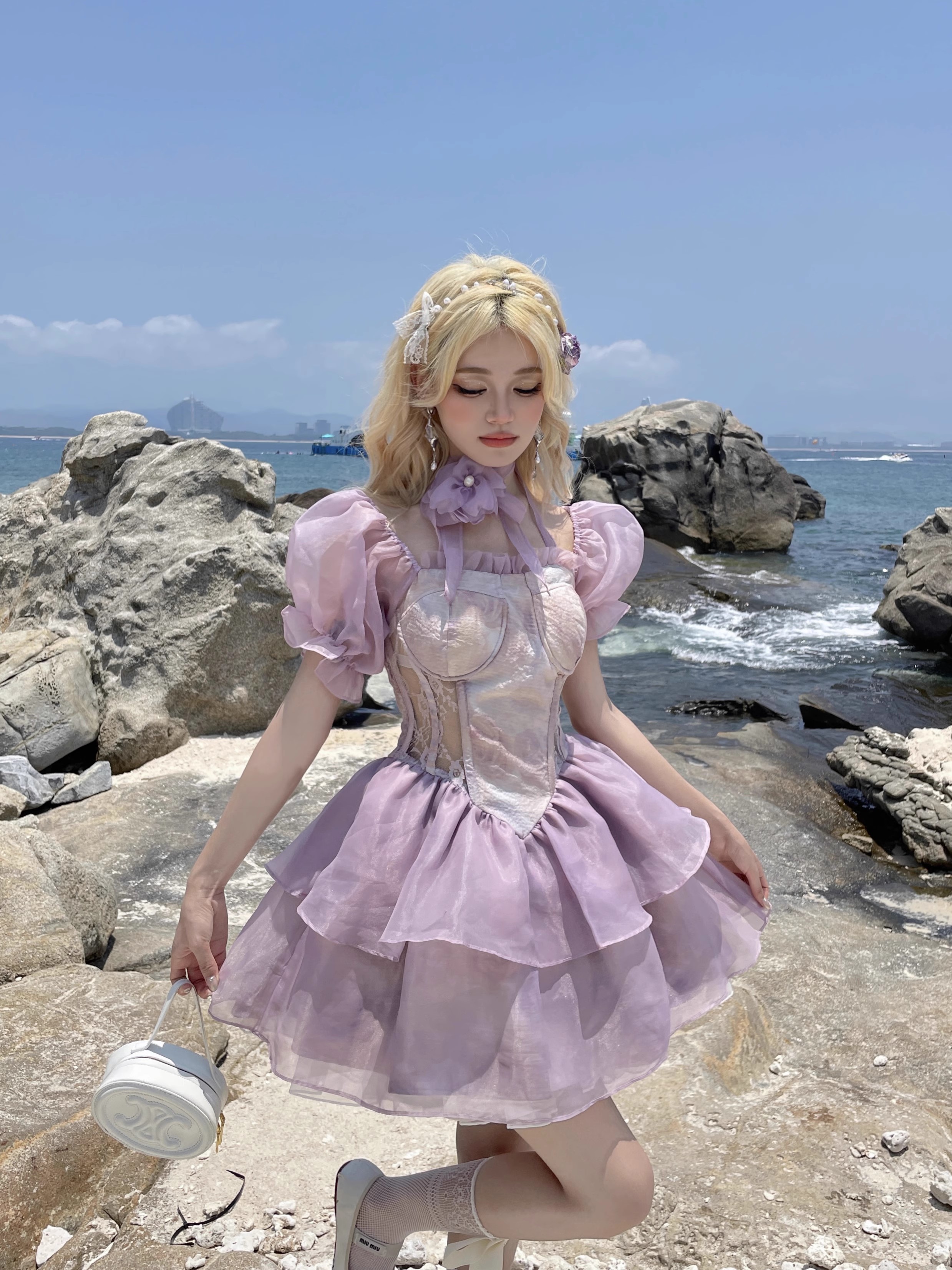 Fairy Lilac Purple Layered Ruffled Flower Corset Balletcore Puff Sleeve Dress