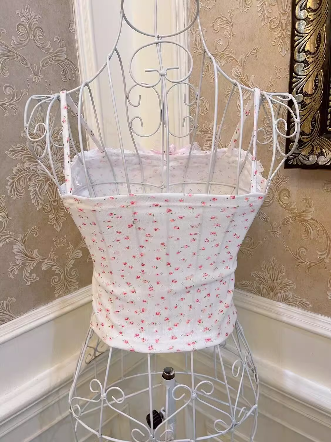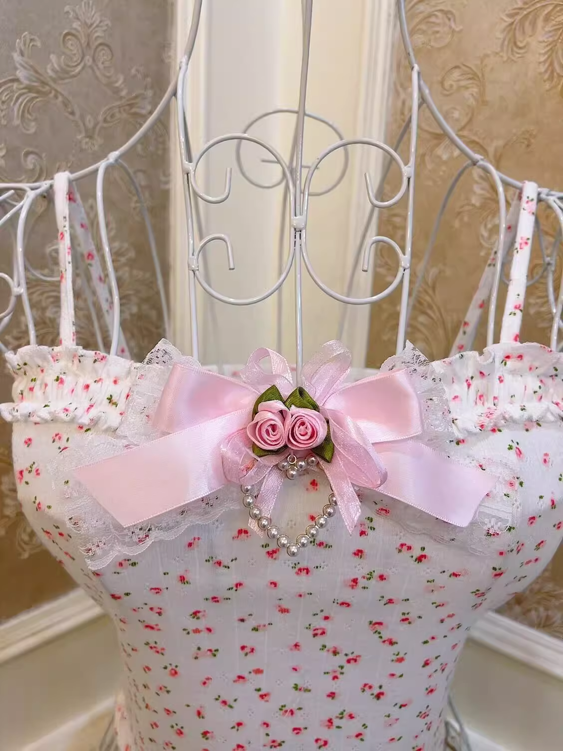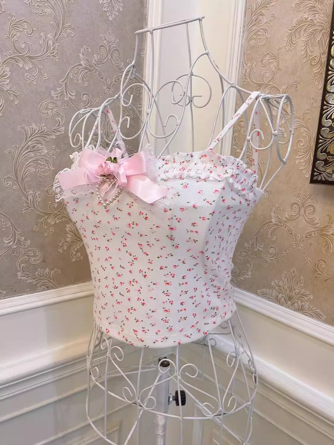 Sweetheart Princess Rose Floral Print White Pink Bow Vintage Coquette Tank Top Strap Camisole