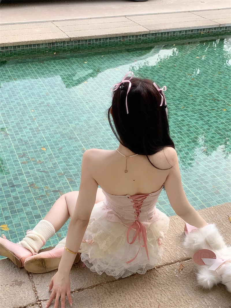 Coquette Sweet Pink Bra Corset Balletcore Strapless Top & White Shorts Two Piece Set