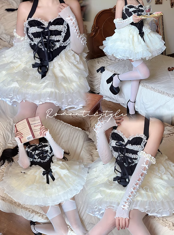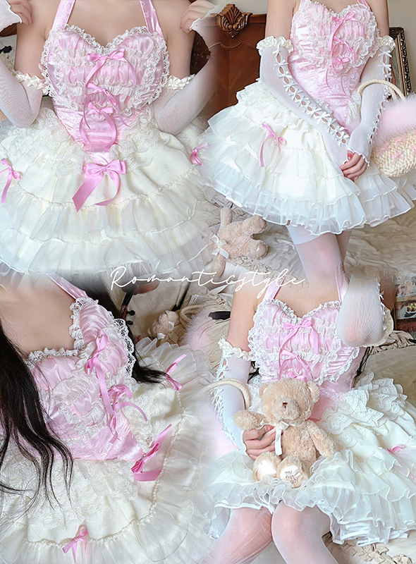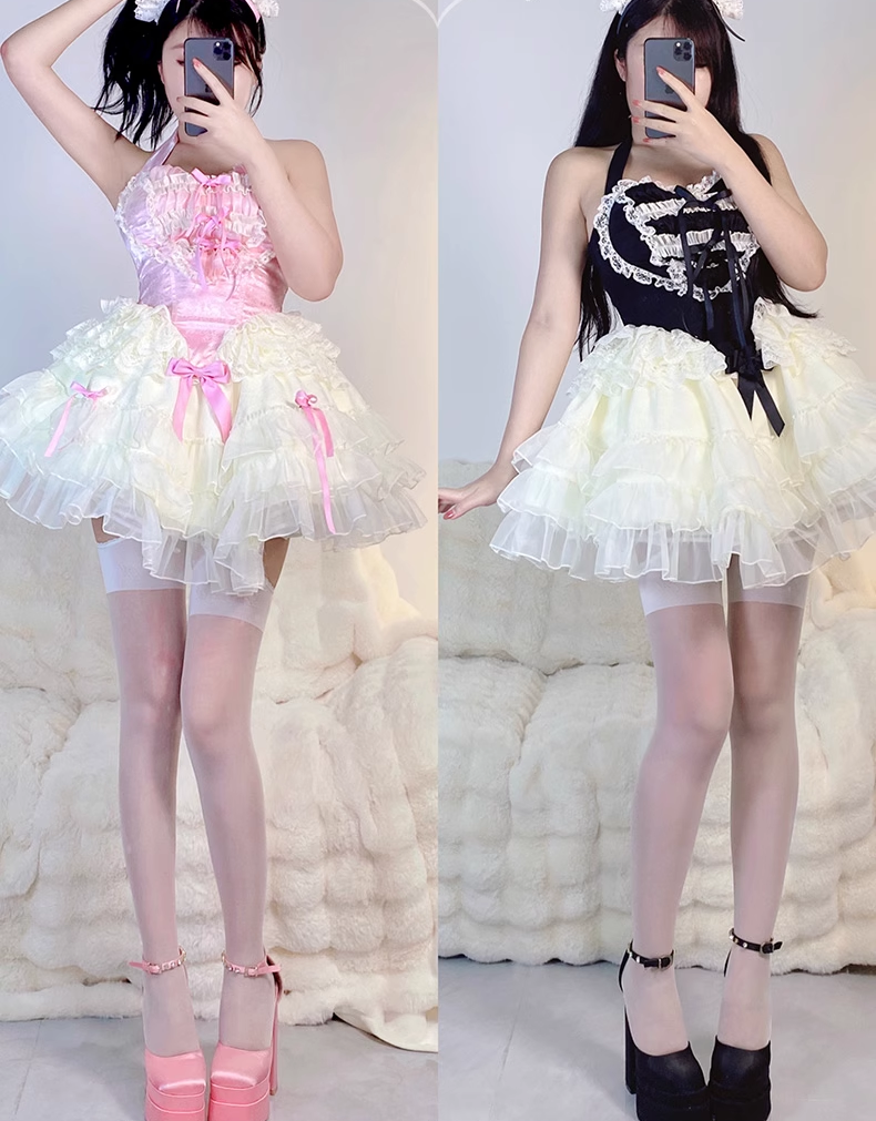Lovely Girl Maid Balletcore Coquette Lace Hearts Black Pink Strap Tulle Dress