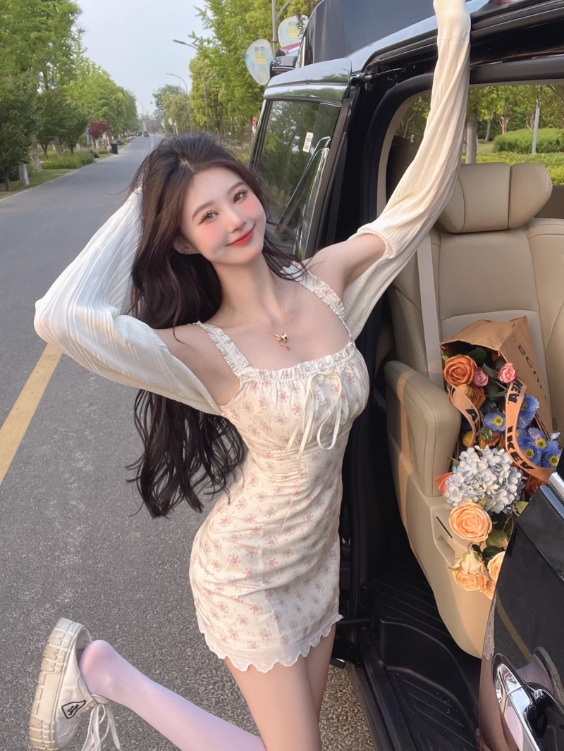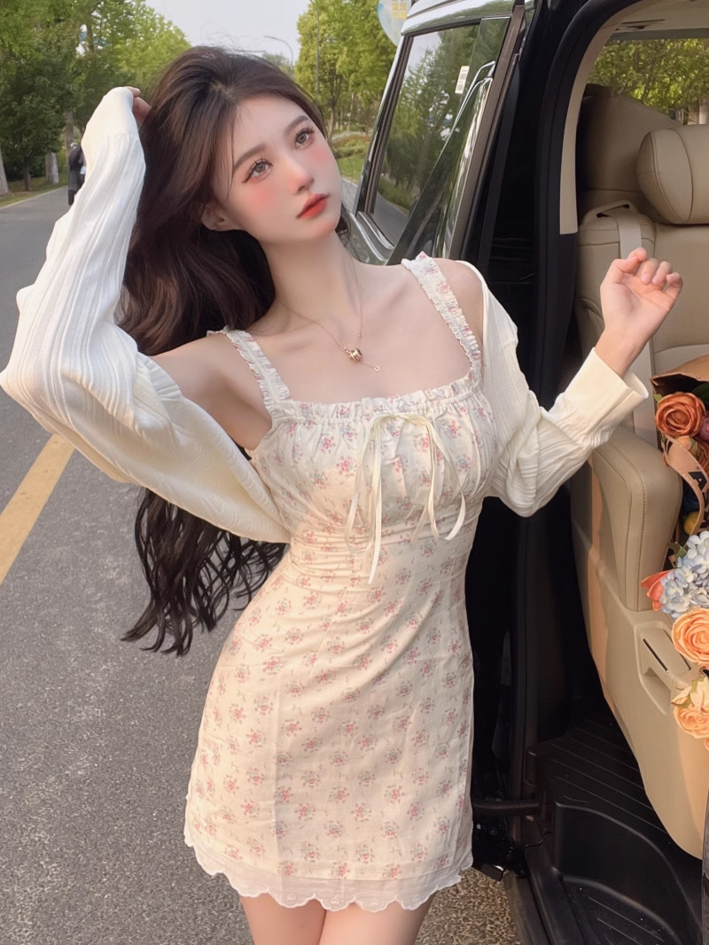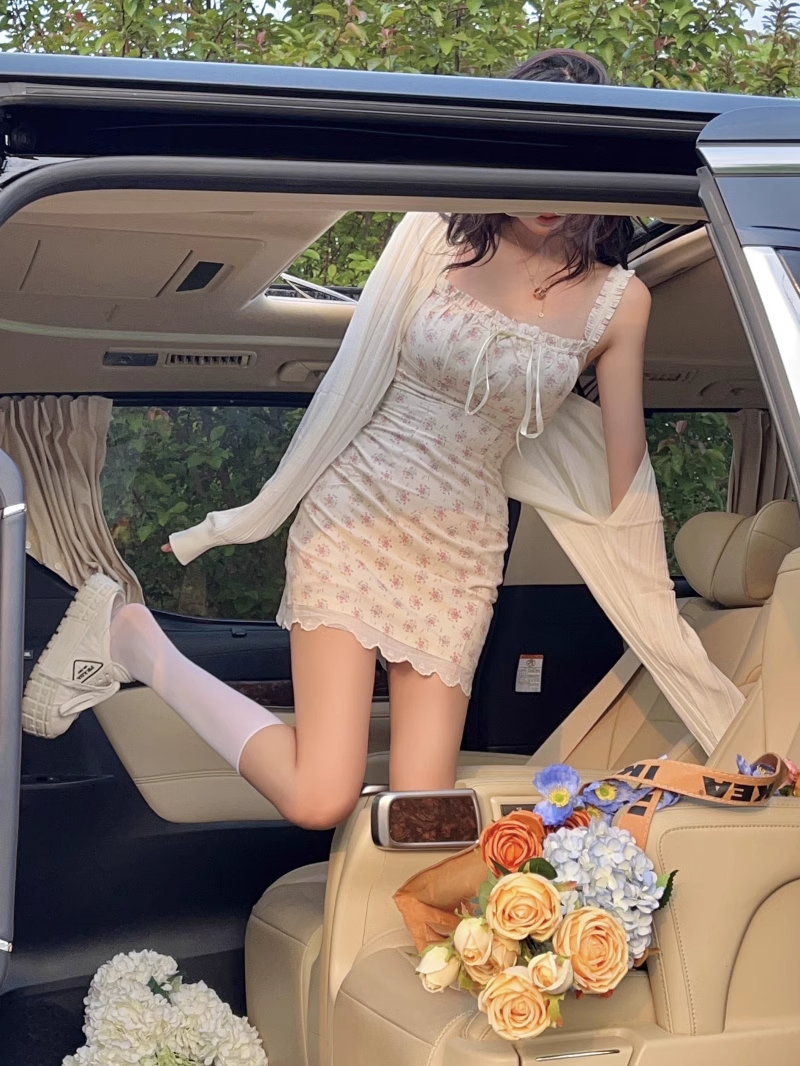 Spring Summer Coquette Sweet Girl Pink Flowers Floral Print White Cream Lace Strap Dress