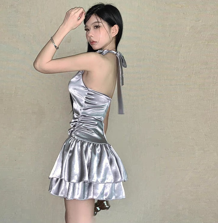 Flower Halter Neck Collar Hot Sexy Silver Summer Night Party Short Dress