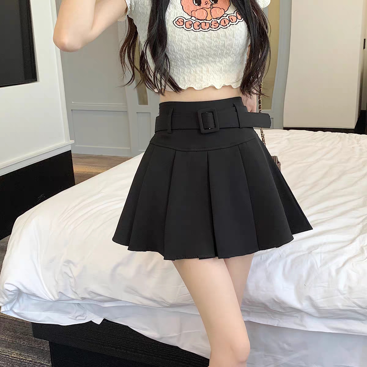 Summer Spring Girl Women White Black Pink High Waist Belt Pleated Skirt