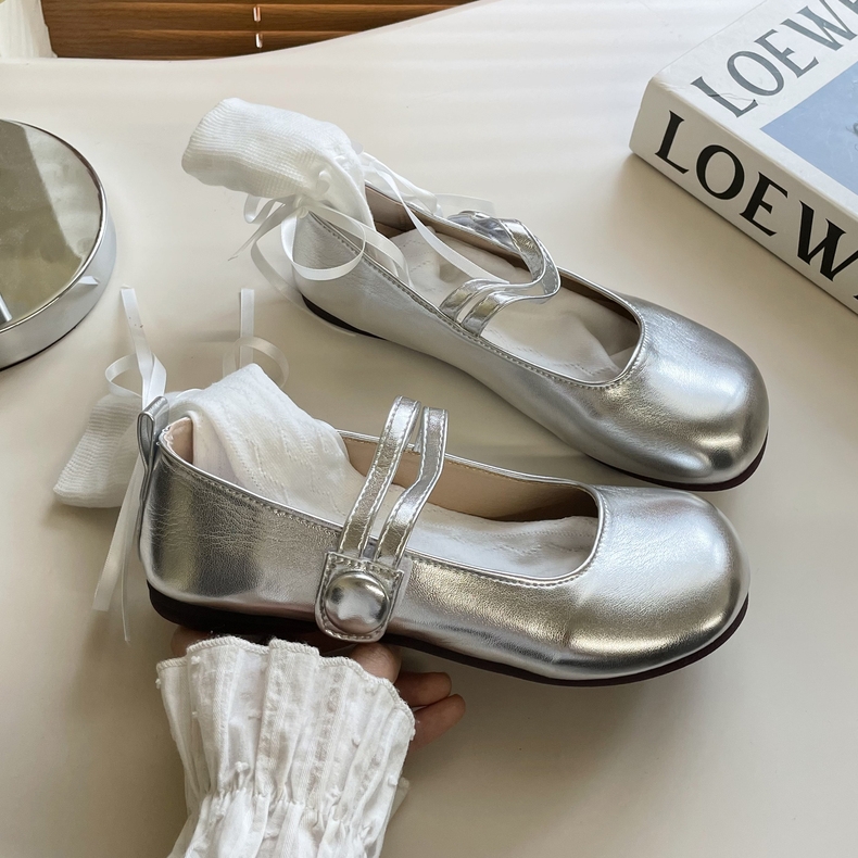 Balletcore Coquette Silver White Black Cute Leather Slipper Mary Jane Flat Shoes
