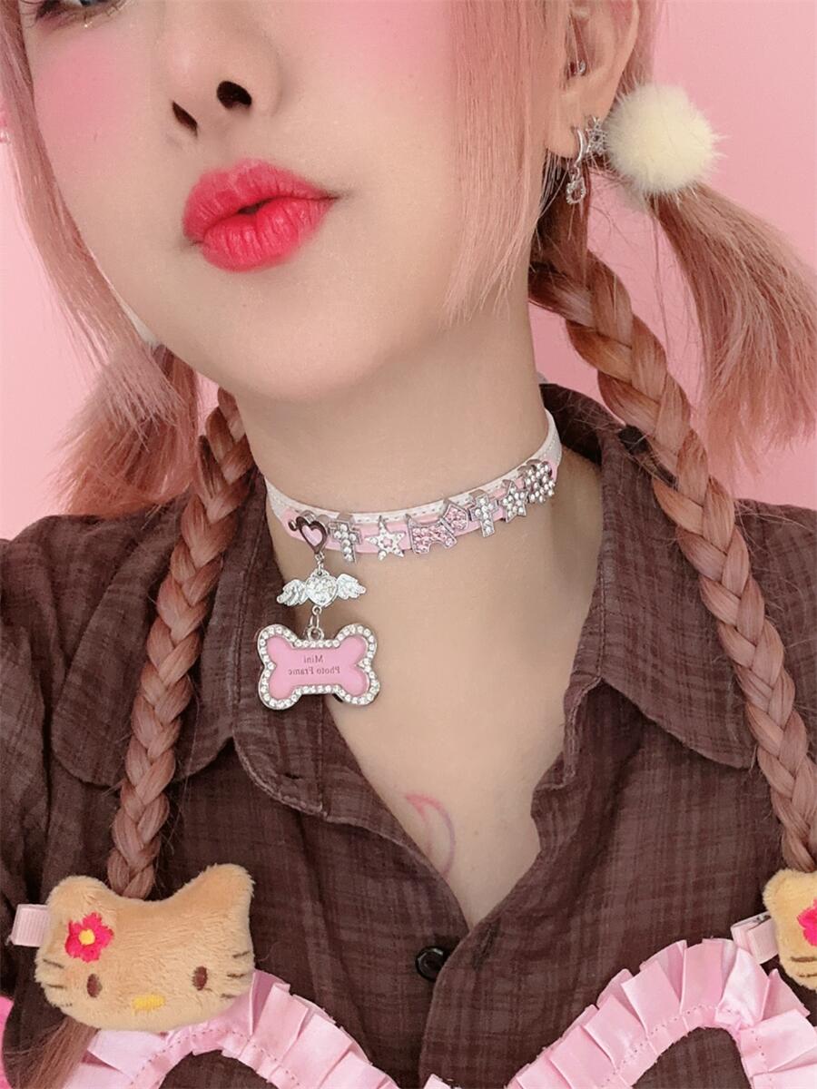 Y2K Harajuku PU Pink Leather Star Bone Collar Choker Necklace