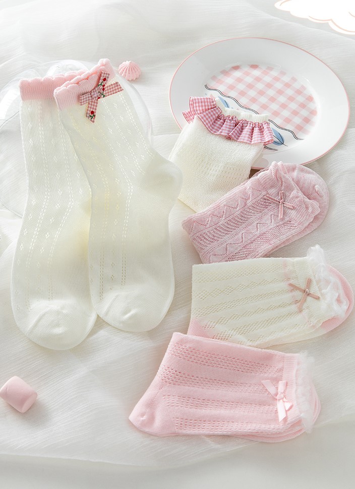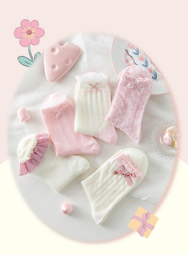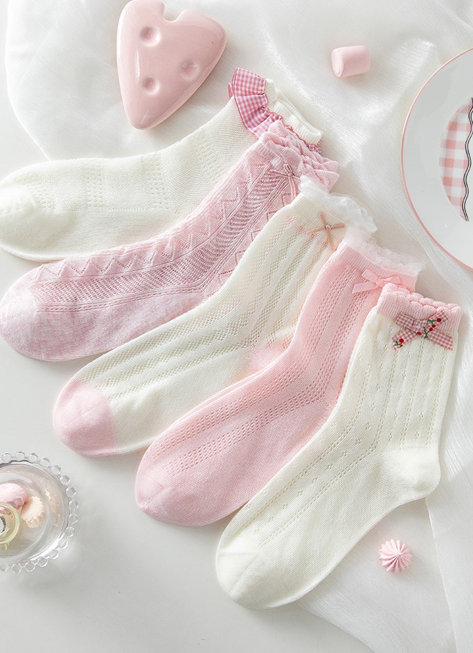 Sweet Coquette Girl Pink & White Cotton Socks 5 Patterns Pairs Sets