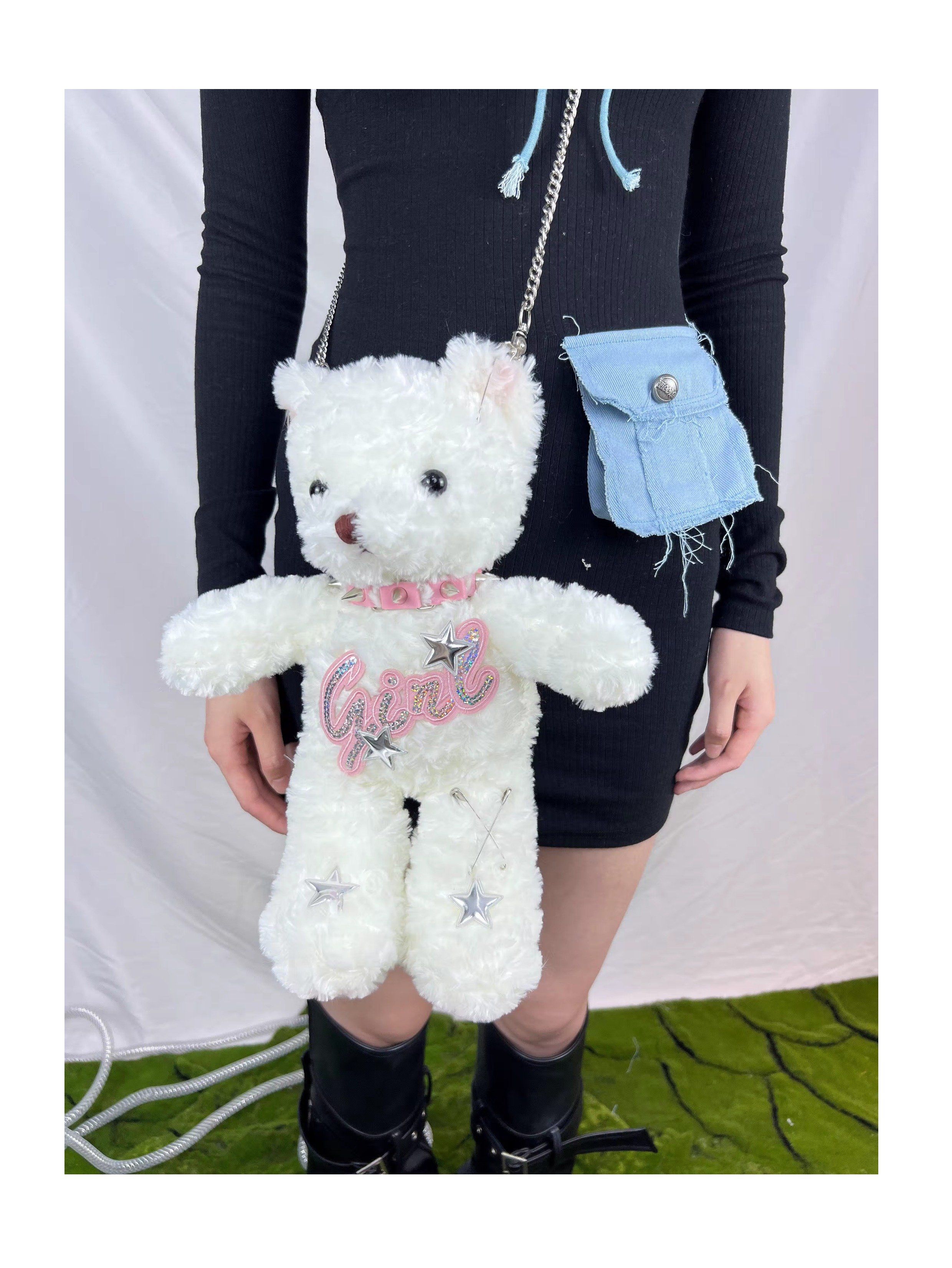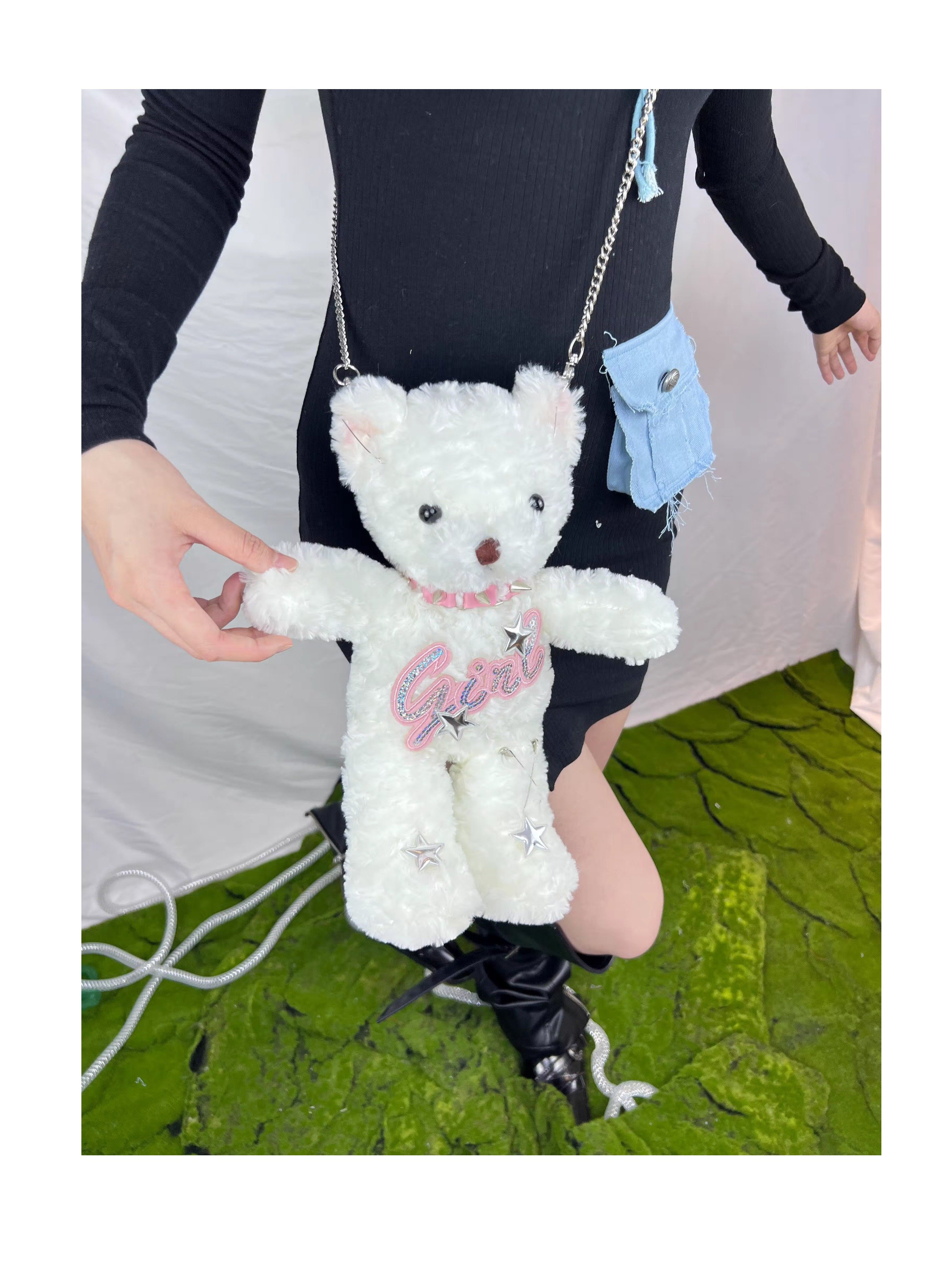 Black White Bear Doll Cute Plush Chain Star Love Collar Coin Purse Bag