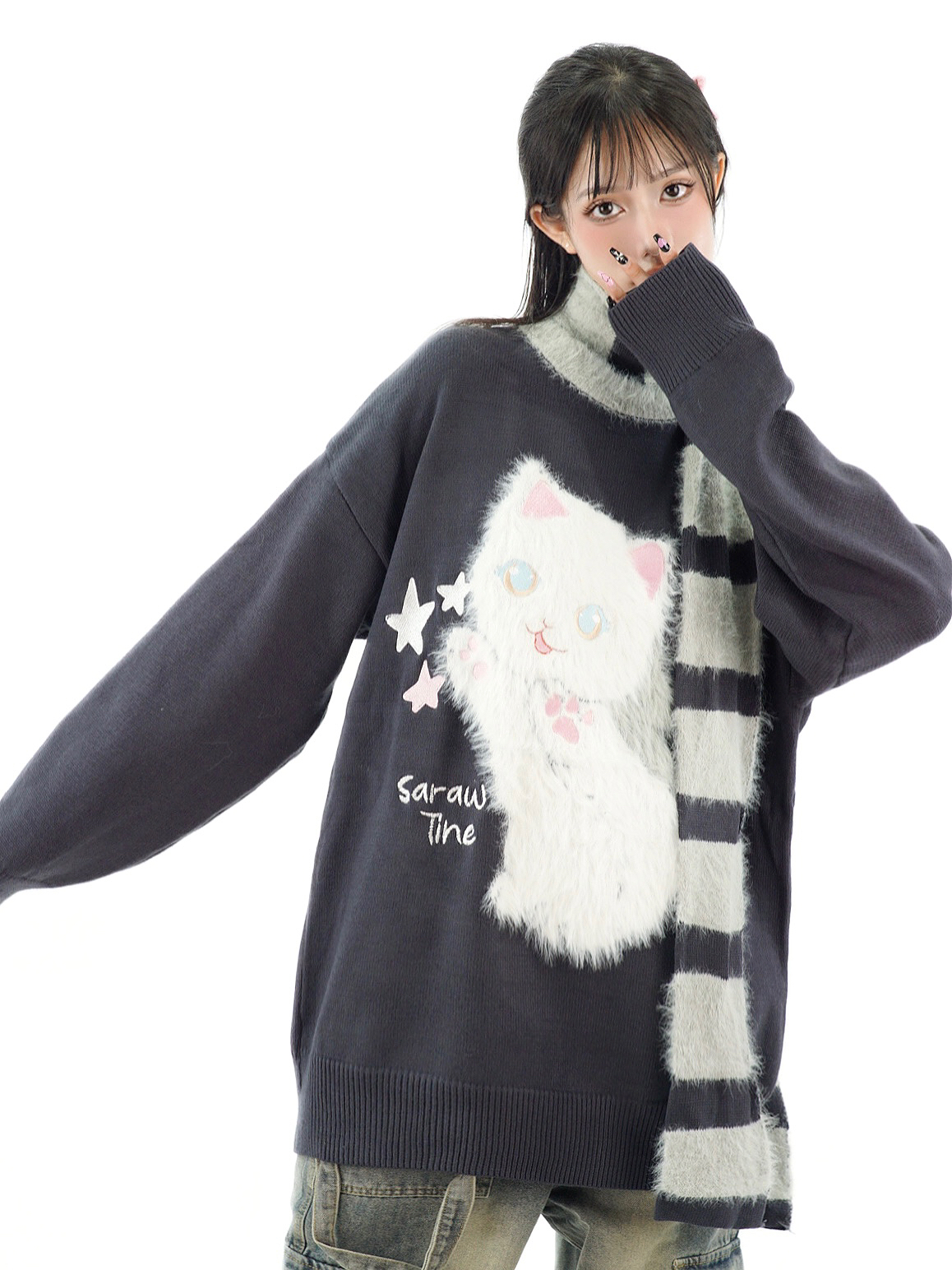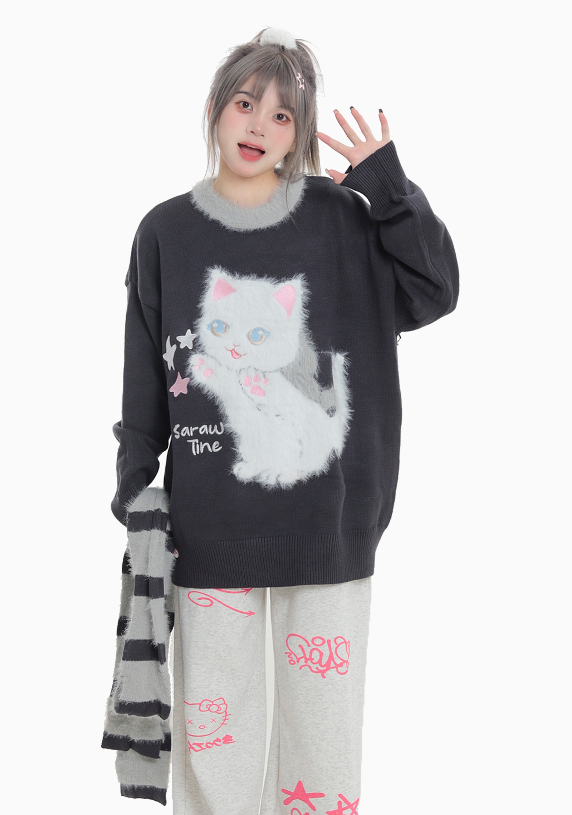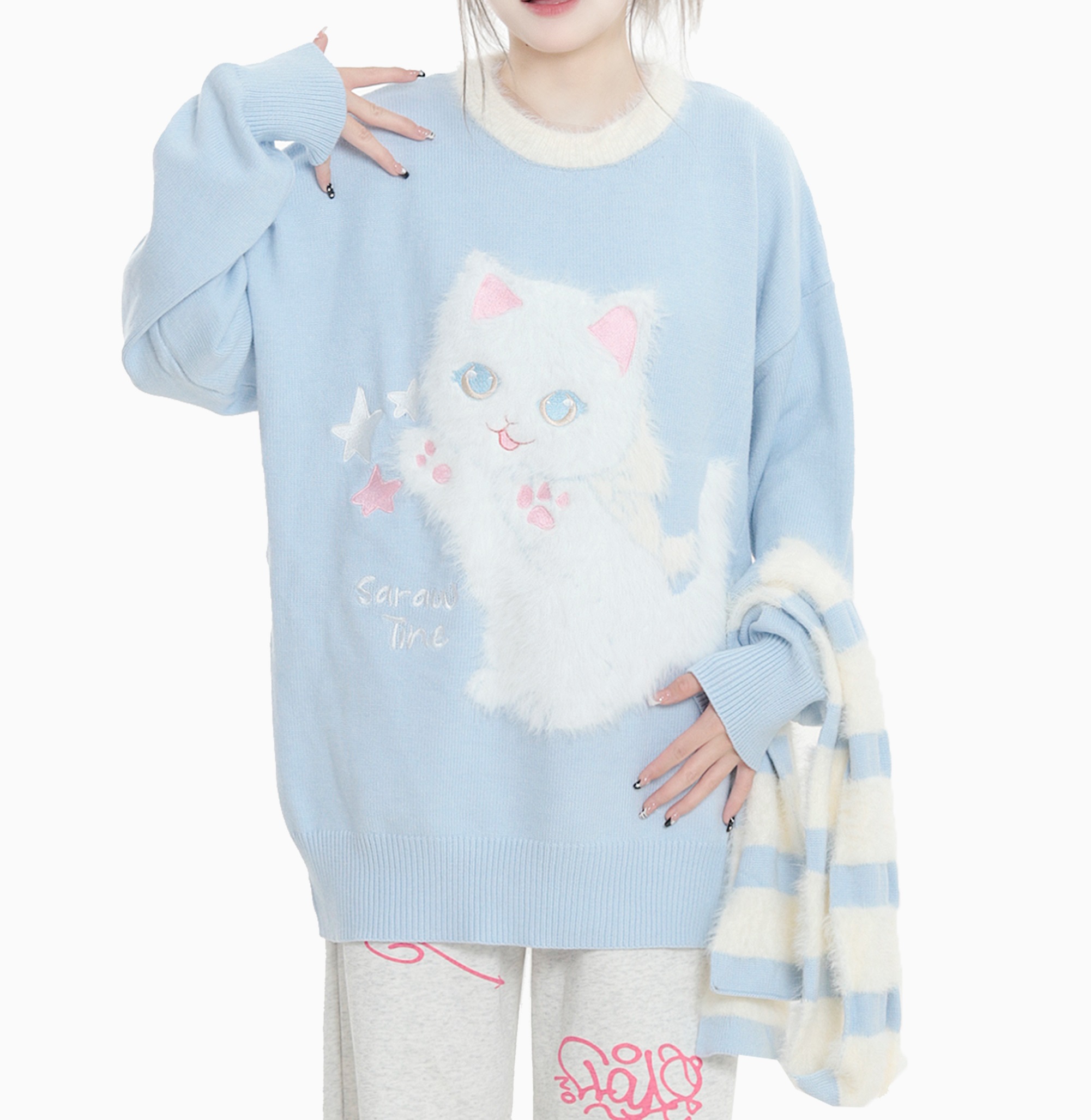 Stars Cute Cat Pullover Knitted Embroidery Oversize Sweater