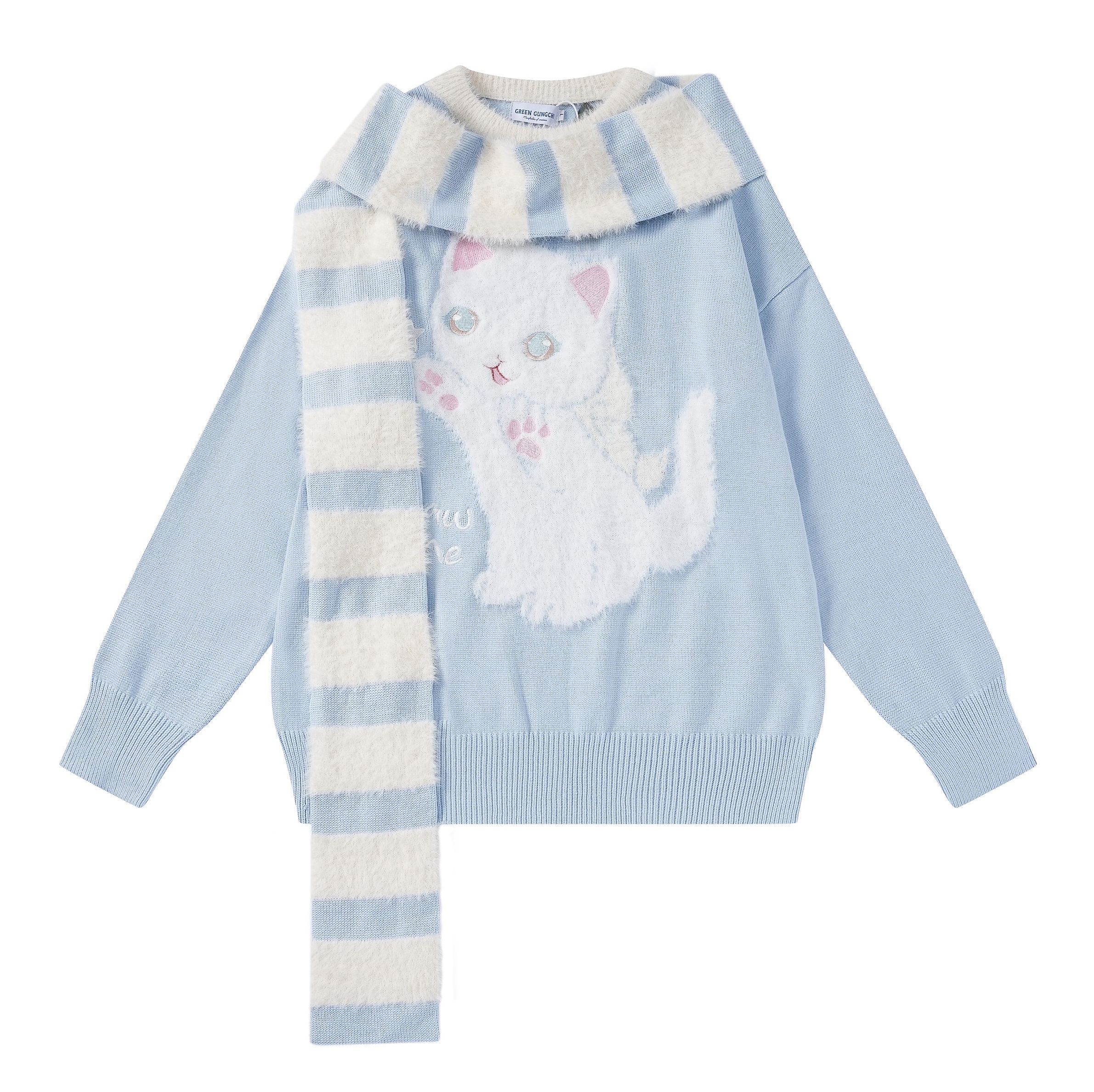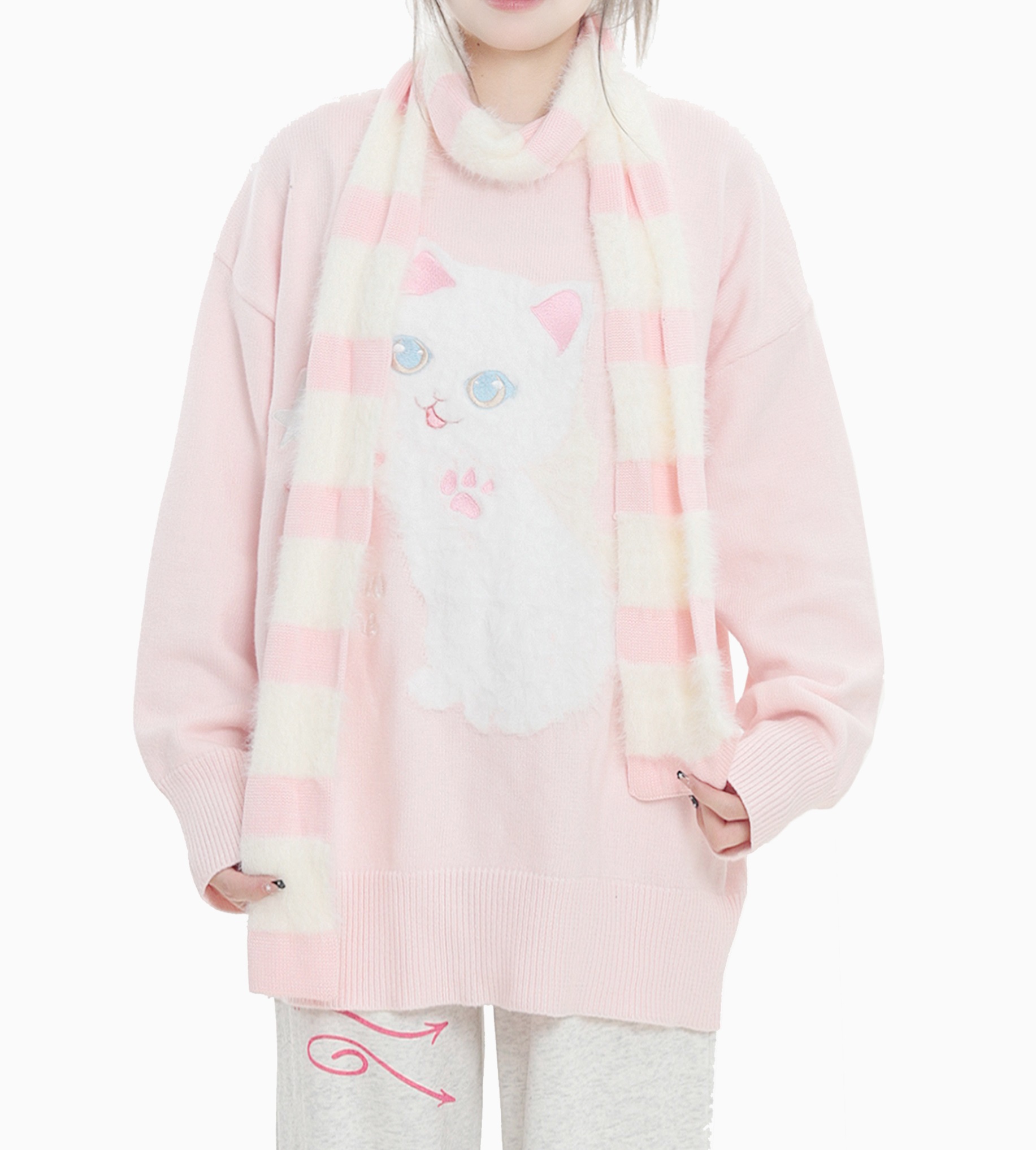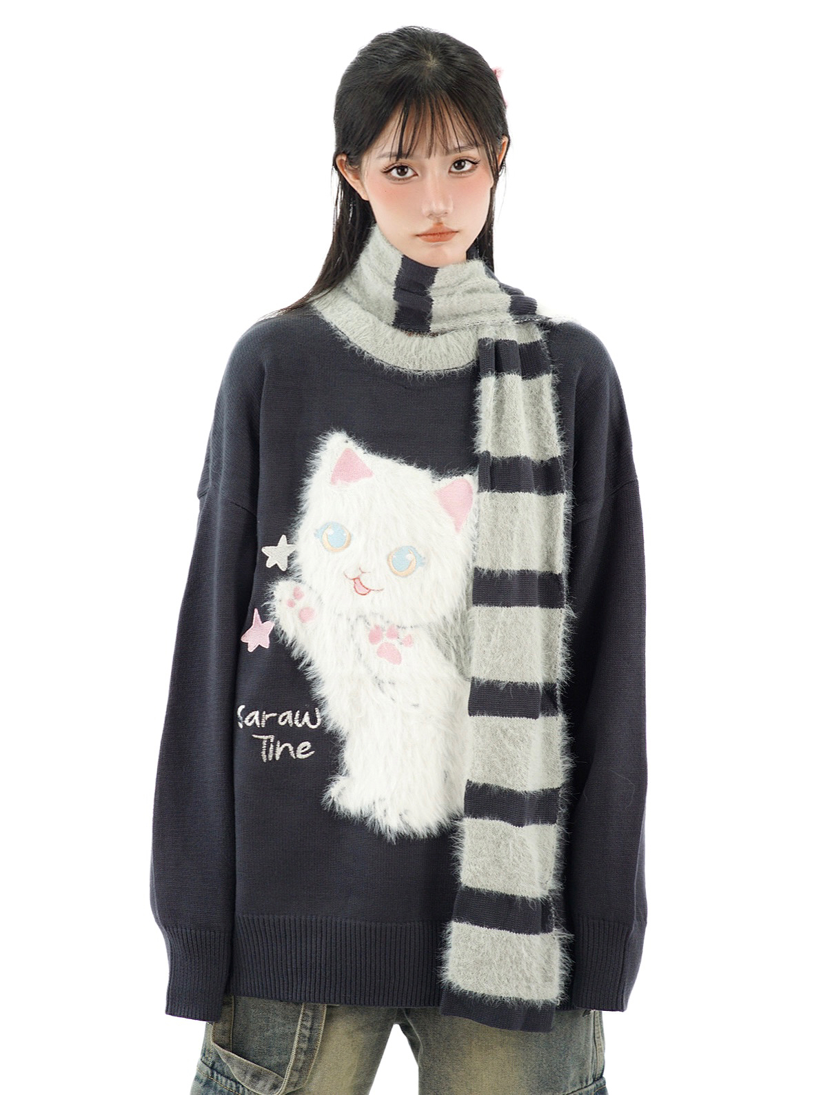 Stars Cute Cat Pullover Knitted Embroidery Oversize Sweater